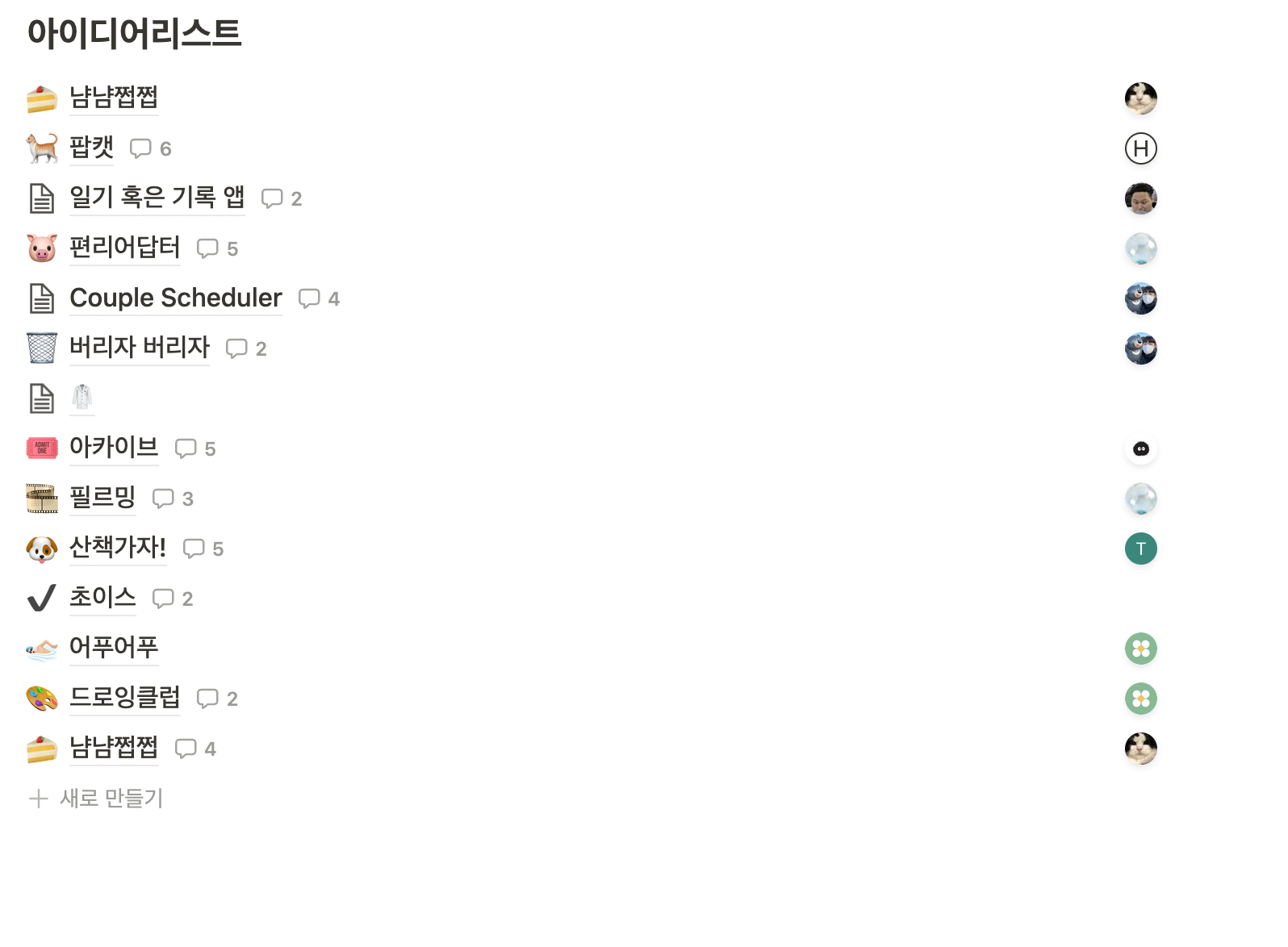당시 나왔던 팀원들의 아이디어 리스트 디자이너는 협업툴을 결정해야 했는 데, 당시 나는 피그마를 사용해보지 않았지만 같은 팀 디자이너 두 명이 피그마를 주로 사용하고 있었고, 이전부터 계속 사용해보고 싶었기에 "오히려 조하~!"라는 마음으로 피그마를 익히며 협업을 진행했다. 팀원 중에 Variants 기능을 정말 잘 활용하는 디자이너 친구가 있어서 프로젝트 진행 중에 많은 팁들도 함께 얻을 수 있었다ㅎㅎ(그리고 이 친구는 뒤에 나와 함께 11기 운영진을 하게 되는데..!!)