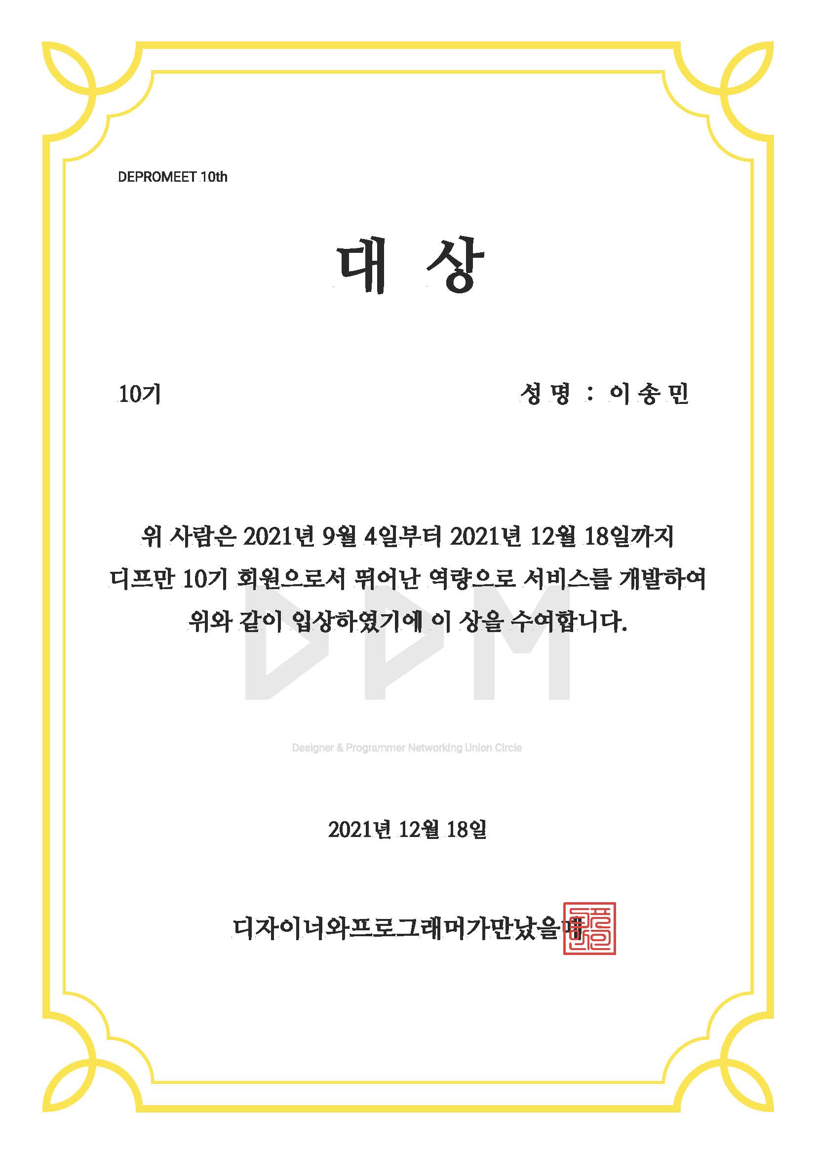 디프만 10기 수료증 / 대상 / 팀원들의 축하 댄스