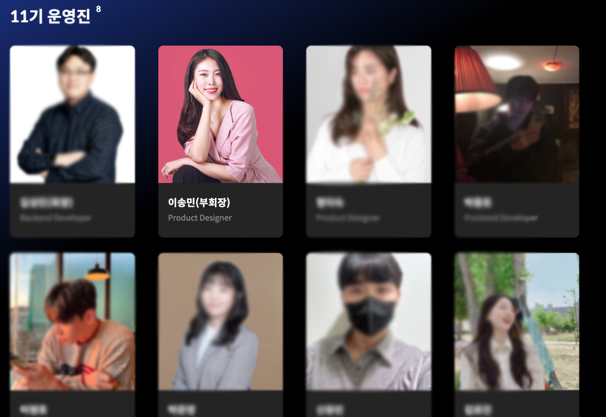 10기 디자이너로 시작해 11기를 운영하기까지 나의 부족함에 아쉬워하기도 때론 짜릿함도 맛봤다. 당돌함으로 시작한 과정은 책임감의 연속이었고 잦은 시행착오도 있었지만, 함께한 7명의 운영진과 4명의 명예회원 그리고 11기 멤버분들 덕분에 분명하게 성장을 경험했다.