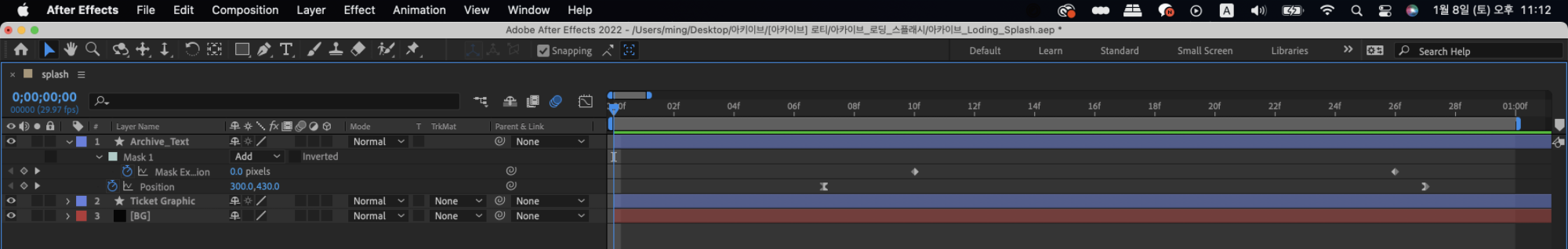 (Archive 텍스트 위에 Shape 도형 레이어를 올린 후 Parent와 Scale의 키프레임 조정을 통해 마스크 효과를 대신했다.)
