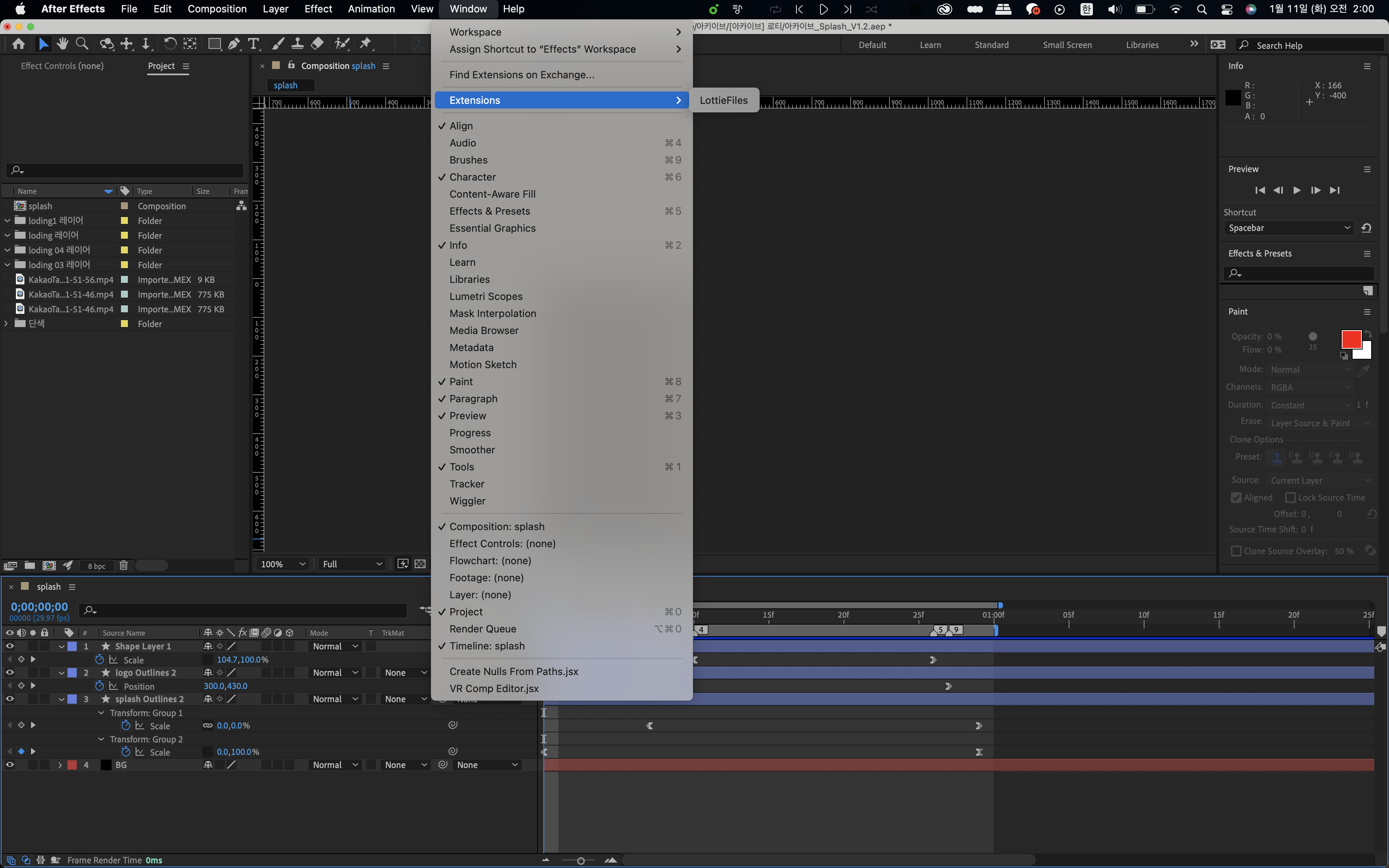 2. 애펙에서 Window> Extention> LottieFiles 실행