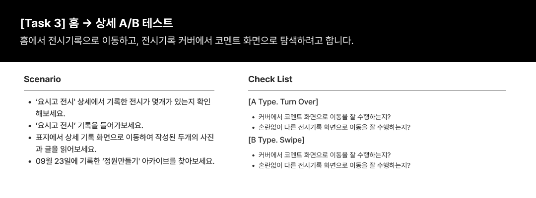 다음은 사용자가 자연스럽게 행동할 수 있도록 각 테스크 별로 작성한 사용자 시나리오입니다. 이처럼 시나리오를 작성하면 유저 테스팅의 부자연스러움을 완화할 수 있다고 합니다.