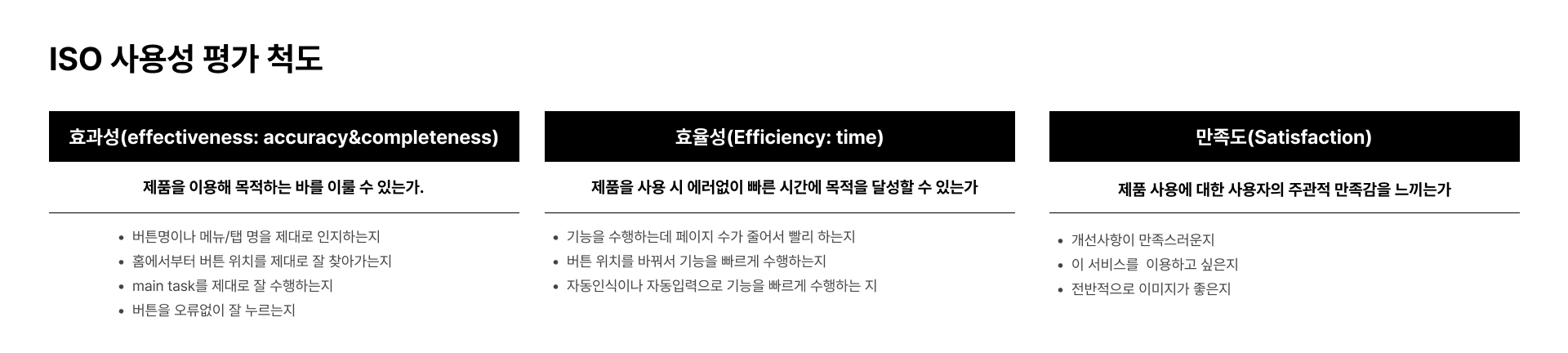 국제 표준 기구(International Standards Organization, ISO)는 사용성을 ‘특정한 사용 상황 내에서 유효하고, 효율적이며, 만족도를 가지고 특정 사용자에 의해 특정 목표를 획득할 수 있도록 사용하는 제품의 정도’라고 정의하고 있습니다.