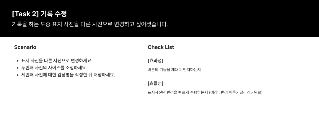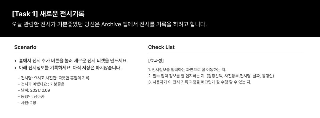 검증하고 자 Task는 1)전시 기록 2) 기록 수정 3) 기록 탐색였습니다.